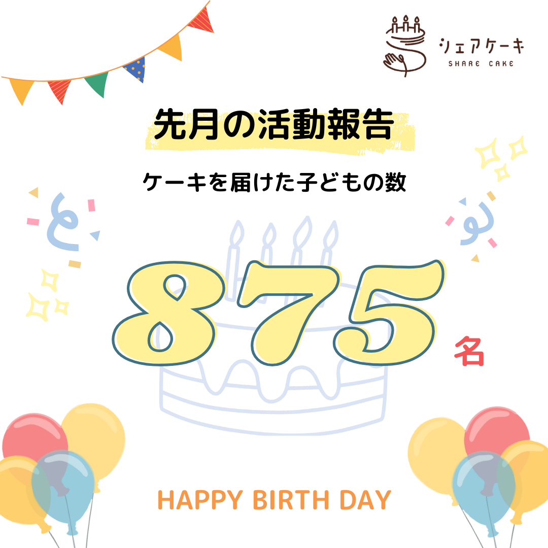 2025年12月は875台のホールケーキを届けました。 投稿日 2026.01.09 著者 hirakawa 新着情報カテゴリー 活動報告 12月は875名の子どもたちへお誕生日ケーキを届けることができました。 「あなたが大切だよ」シェアケーキはそんな想いを誕生日ケーキにこめて届ける活動です。この活動に共感し、ご協力いただいております全ての皆様に感謝申し上げます。 365日やってくる誕生日のサポート継続のため、引き続き取り組んでいきます。応援よろしくお願い致します。(※キャンセルなどによって修正が入る場合があります。正確なものは事業報告書でご報告させていただきます。) この記事を書いた人 hirakawa 記事一覧